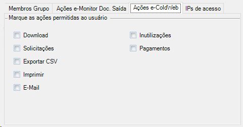 Marque as ações que este usuário/grupo terá ações permitidas no e-ColdWeb.