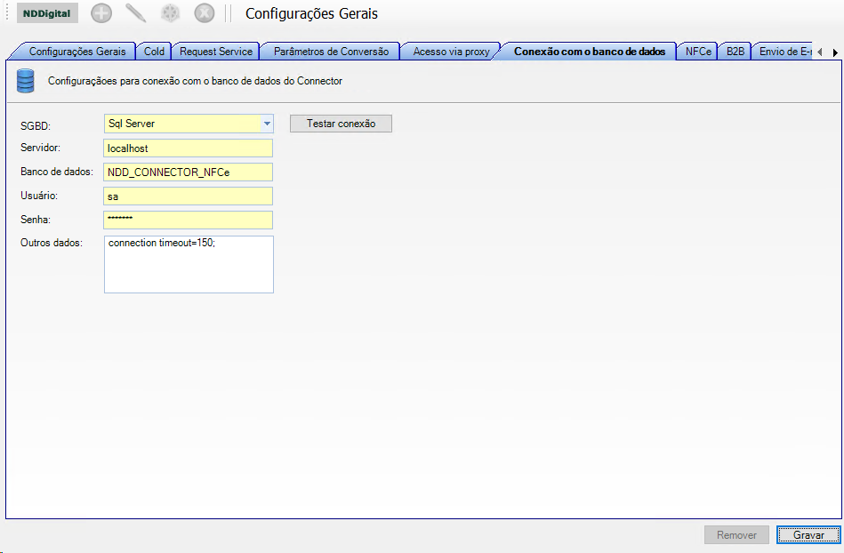 Acesse o e-Connector Settings e na área de configurações, clique em Configurações Gerais > Conexão com o banco de dados. A seguinte tela é apresentada:
