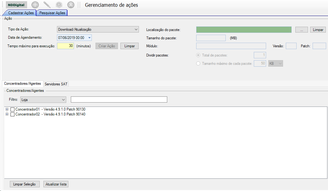 Selecione os Concentradores/Agente ou os Servidores SAT, através das abas contidas abaixo da área de ação.