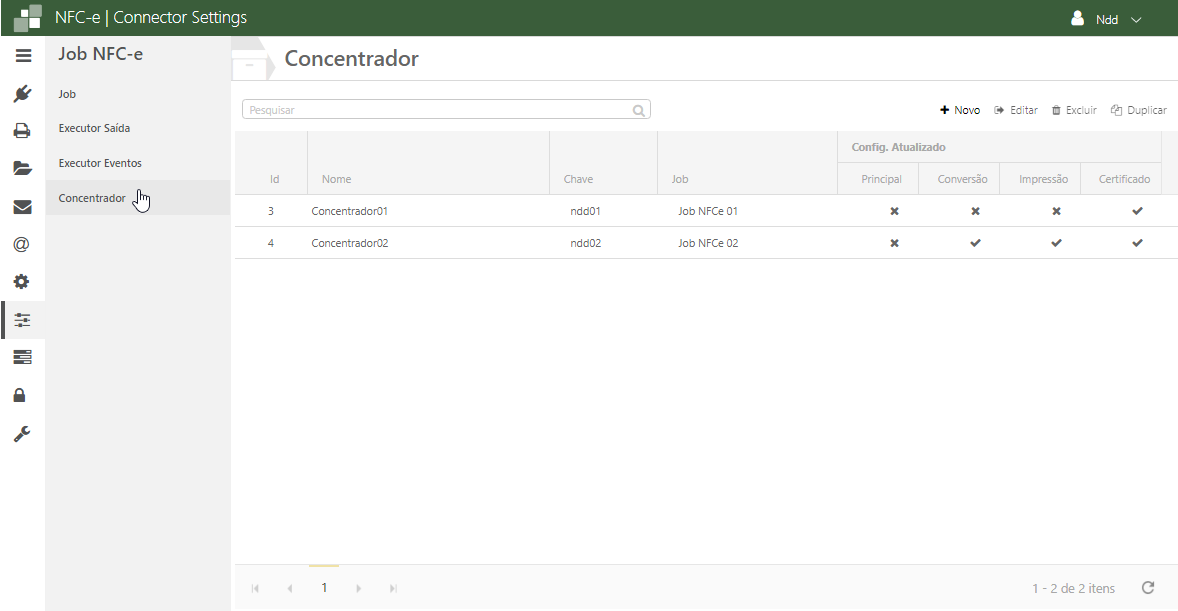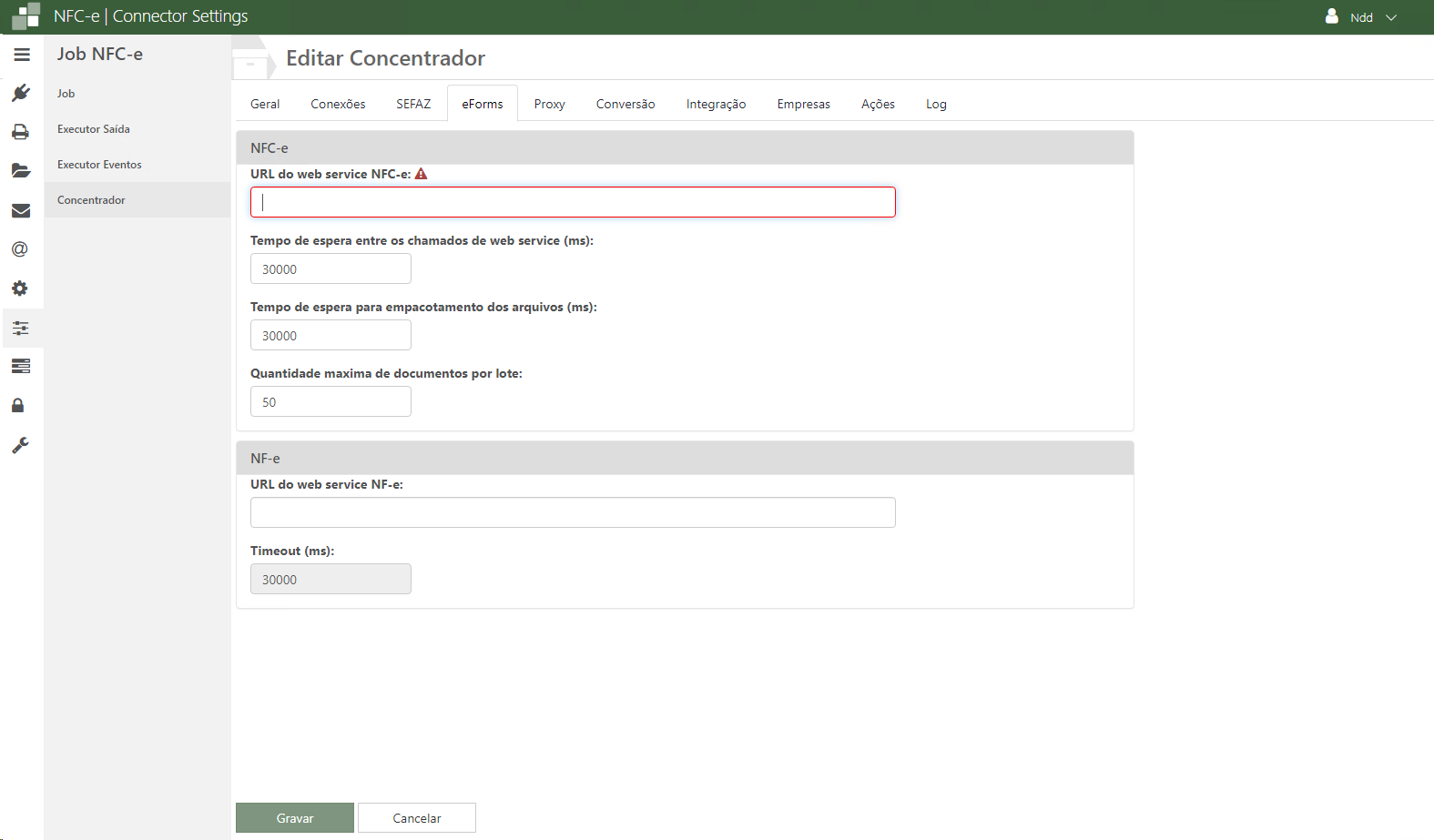 Acesse o e-Connector Settings e na área de Jobs NFC-e, clique em Concentrador. A seguinte tela é apresentada: