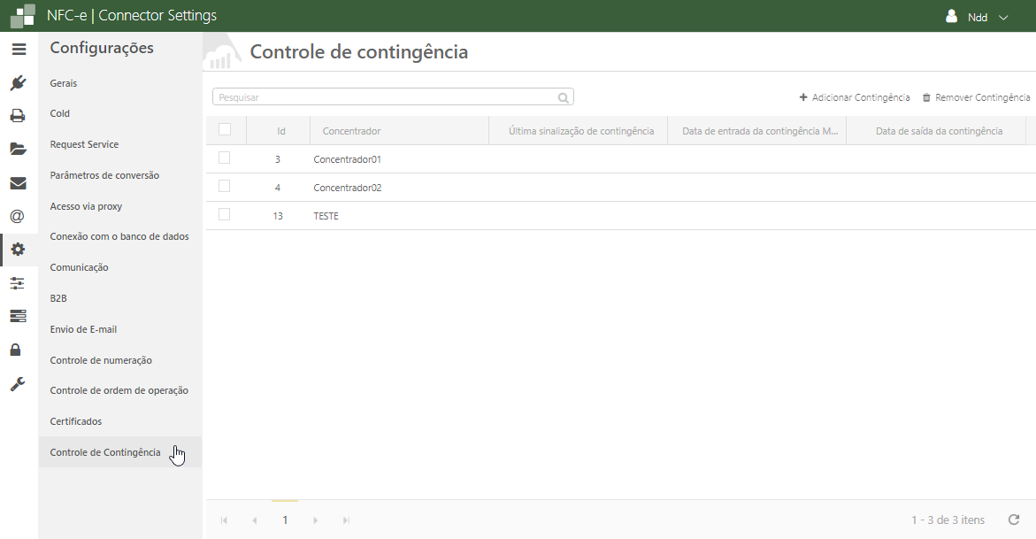 Acesse o e-Connector Settings e na área de configurações, clique em Controle de Contingência. A seguinte tela é apresentada:
