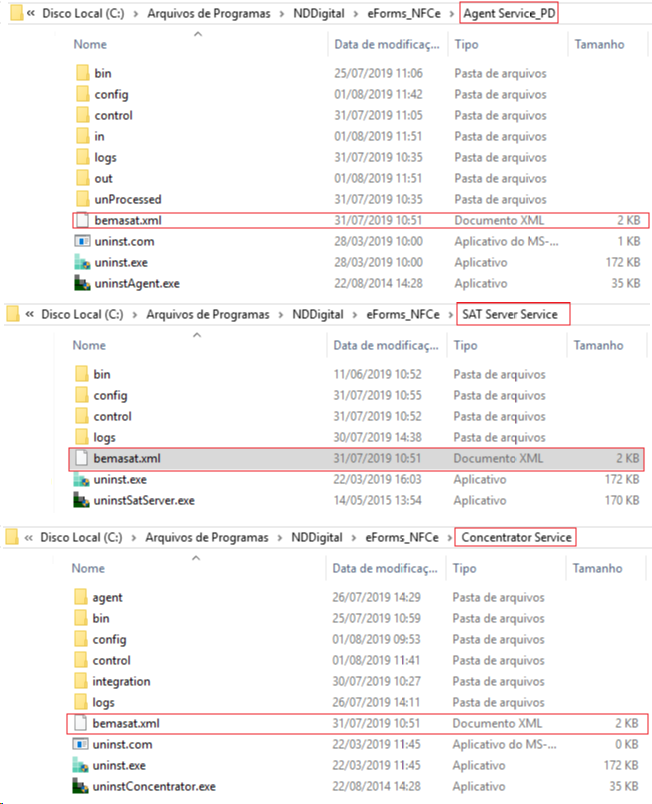 ✓ O arquivo de configuração bemasat.xml deve estar na raiz do módulo Java, o qual realiza a comunicação com o mesmo, podendo esse ser: o Agente, o SAT Server ou o Concentrador.