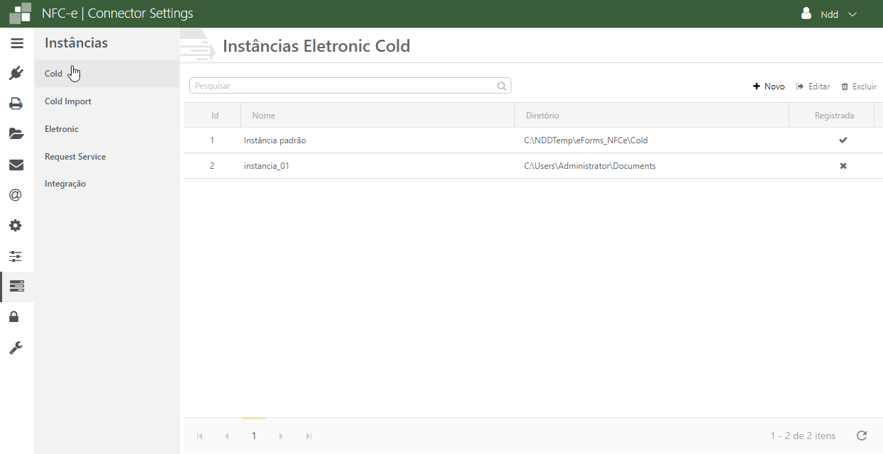 Acesse o e-Connector Settings e na área de Instâncias, clique em Cold. A seguinte tela é apresentada: