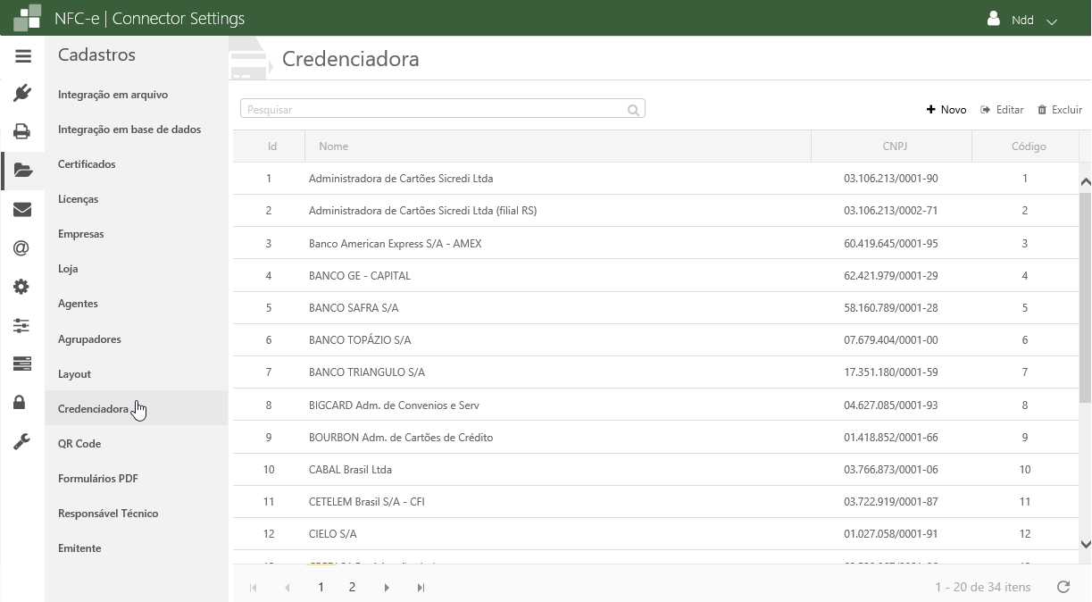 Acesse o e-Connector Settings e na área de cadastros, clique em Credenciadora. A seguinte tela é apresentada: