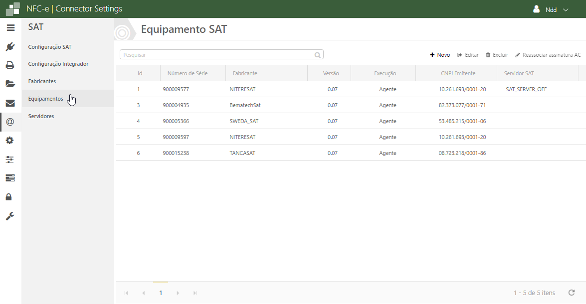 Acesse o e-Connector Settings e na área de SAT, clique em Equipamentos. A seguinte tela é apresentada: