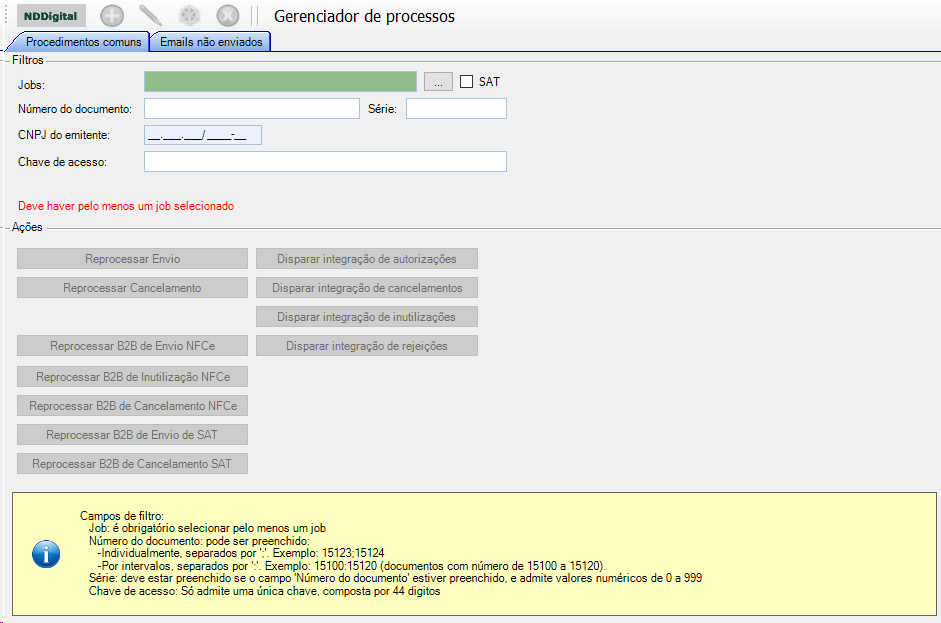 Esta ferramenta auxiliará aos usuários a acompanhar o andamento dos processos na base do Connector e também executar algumas ações comuns sobre estes processos, as quais geralmente são executadas pelo suporte NDDigital, como reprocessar algum documento ou adiar algum tipo de processo. Estas operações estão disponíveis tanto para NFC-e.