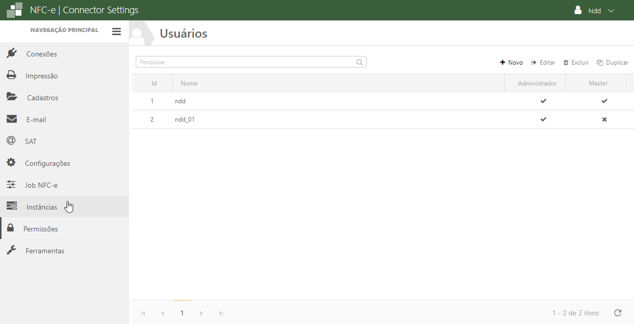 Através dessa área é possível realizar os cadastros referente as instâncias da solução NFCe, sendo estes: Cold, Cold Import, Eletronic, Request Service e Integração.