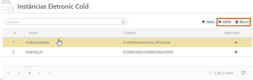 Acessando esta área, será possível criar um novo registro, editar e excluir os registros. Para isso, todas as telas seguem o mesmo padrão, onde deve sempre ser selecionado um registro para que as opções destacadas na imagem a seguir sejam habilitadas, com exceção da ação +Novo.