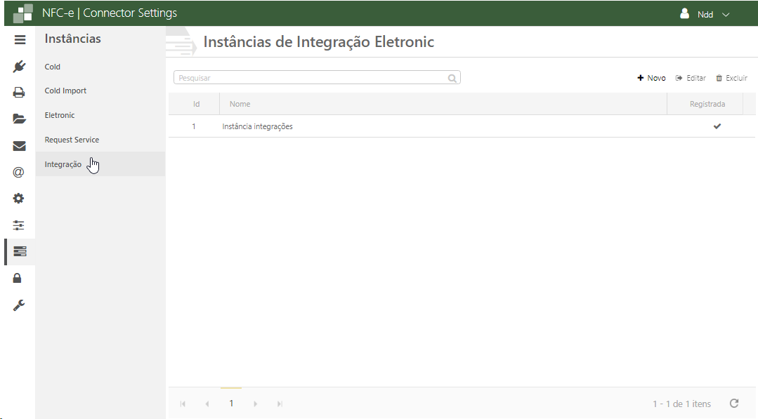 Acesse o e-Connector Settings e na área de Instâncias, clique em Integração. A seguinte tela é apresentada: