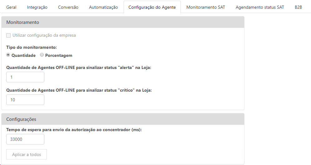 ✓ Aplicar a todos: Caso o usuário possua muitos agentes e precise alterar a configuração desses já existentes, basta realizar a alteração nesta aba e clicar em Aplicar a todos, para que a nova configuração seja aplicada em todos os agentes.