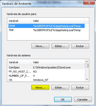 A janela Variáveis de Ambiente... surgirá e nesse momento deverá ser adicionada uma nova Variável do Sistema, clica-se então na opção Novo conforme destacado na imagem abaixo: