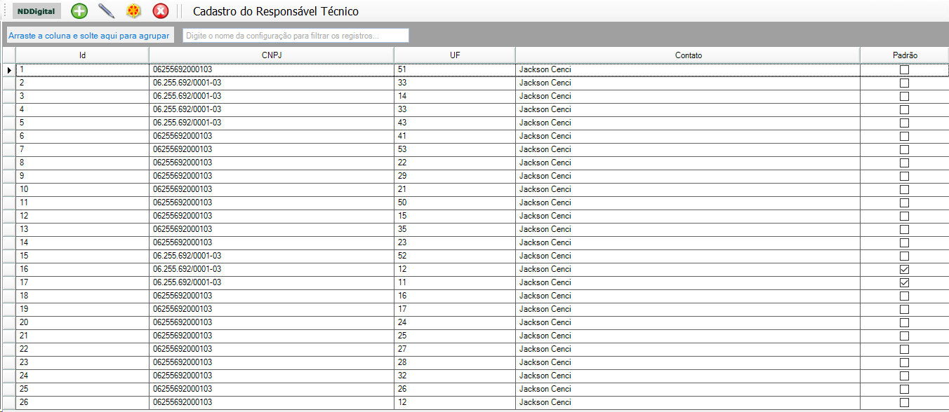 ✓ Não terá responsável técnico os documentos sem o cadastro no Settings para a UF de onde os mesmos serão emitidos e não ser informado os campos na massa; ✓ Será apresentado a tela de cadastro, onde os botões de adicionar, duplicar e excluir estão disponibilizados apenas para usuário com perfil master.