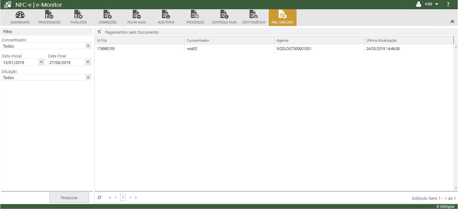 ✓ Situação: Selecione a situação em que o documento que deseja pesquisar encontra-se, os quais podem ser igual a: sem pagamento, sem status pagamento, sem status validador e sem resposta fiscal ;