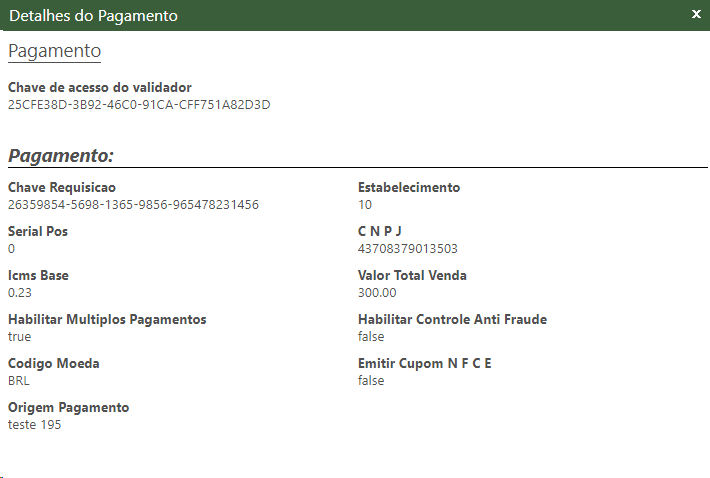 Para visualizar os detalhes do pagamento, deve ser realizado duplo clique sobre o registro desejado, onde a seguinte tela é apresentada.