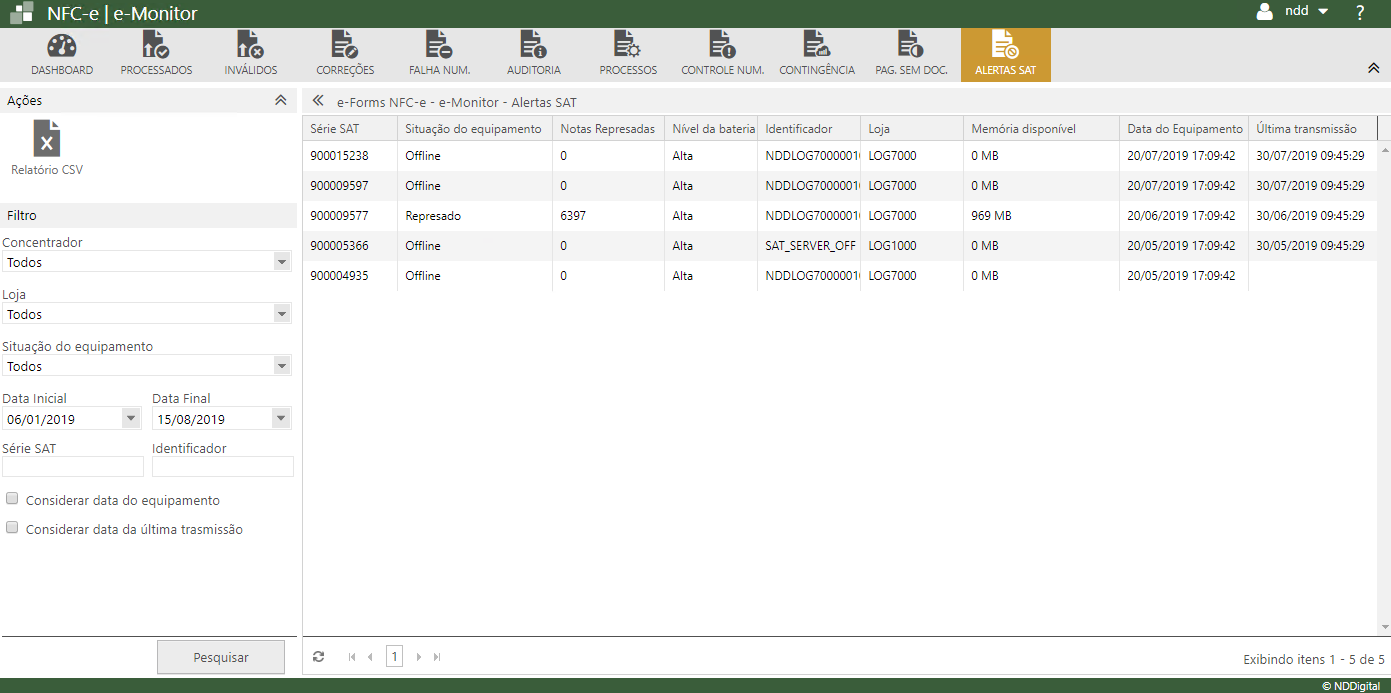 Através desta aba é possível visualizar todos os equipamentos SAT, onde pode ser realizado filtros da situação dos mesmos, bem como de todas as outras informações apresentadas na tela.