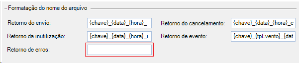 Formatação do nome do arquivo: Nome que será dado aos arquivos de retorno, onde o mesmo pode receber três parâmetros para identificá-los, sendo eles: chave de acesso {chave}, data de envio {data}, hora de envio {hora} e o tipo de evento {tpEvento}, o qual é um parâmetro utilizado somente para retorno de eventos. Para diferenciar o tipo de cada arquivo, deve possuir no final do nome: _env (arquivo de envio), _inut (arquivos de inutilização), _erro (arquivos de erros) e _evt ( arquivos de evento).
