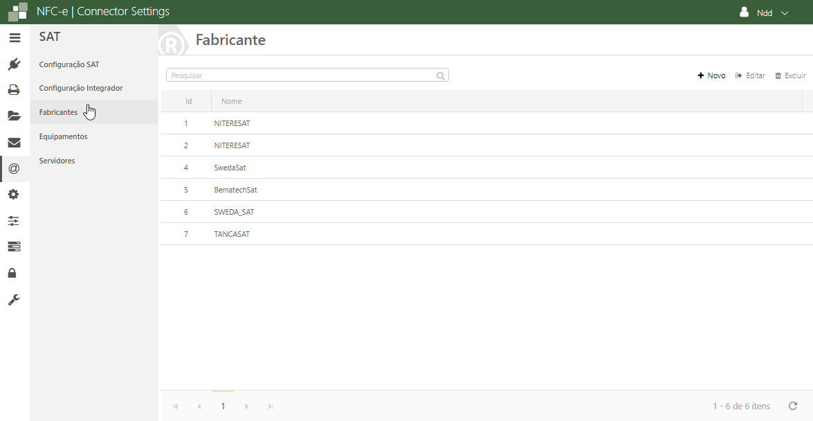 Acesse o e-Connector Settings e na área de configurações, clique em Fabricantes SAT. A seguinte tela é apresentada:
