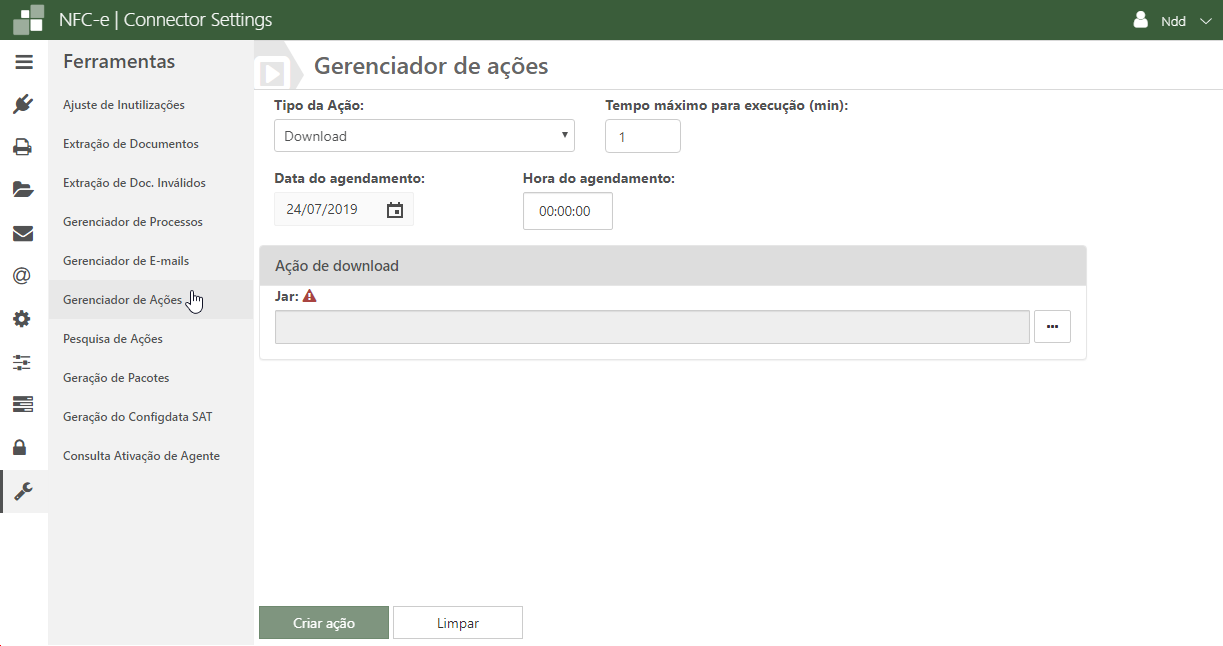 Acesse o e-Connector Settings e na área de Ferramentas, clique em Gerenciador de Ações. A seguinte tela é apresentada: