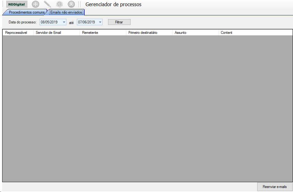 Ainda na área de Ferramentas, clique em Gerenciador de Processos > Emails não enviados. A seguinte tela é apresentada: