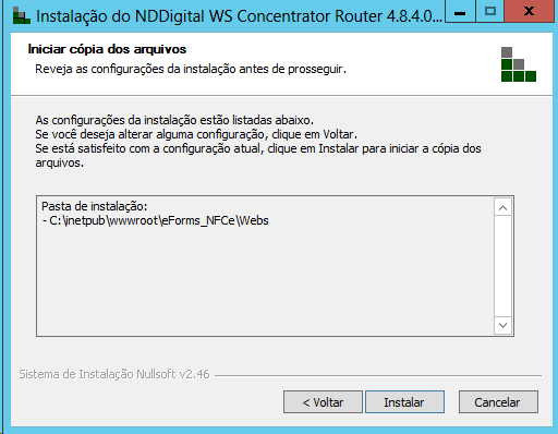 As configurações realizadas são listadas antes de iniciar a instalação. Reveja as configurações, caso deseje alterar alguma delas, clique em voltar. Se todos os parâmetros configurados estiverem de acordo com o desejado, clique no botão Instalar para iniciar a instalação do produto.
