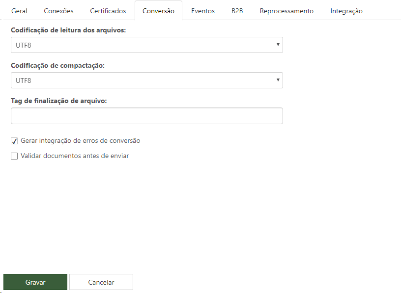 ✓ Tag de finalização de arquivo: Esta opção deve ser utilizada para especificar alguma tag (conjunto de caracteres), que identifique o final de um arquivo TXT. Durante o processamento, se o campo tag de finalização estiver preenchido e o sistema não encontrar no arquivo TXT o conjunto de caracteres especificado irá considerar o arquivo inválido;