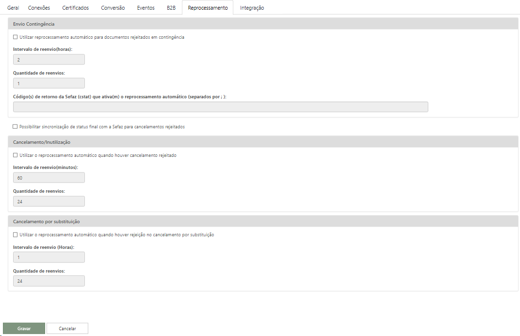 ✓ Utilizar o reprocessamento automático quando houver rejeição no cancelamento por substituição: Marque esta opção para habilitar os campos de intervalo e quantidade de reenvios quando houver rejeição no cancelamento por substituição;