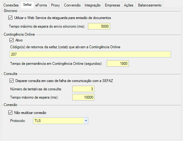 ✓ Tempo máximo de espera (ms): Tempo máximo de espera, para a falha de comunicação com a SEFAZ.