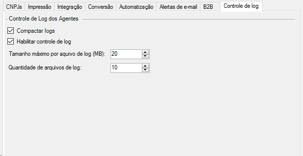 Através dessa aba é possível habilitar as configurações a respeito do controle de log, onde ao habilitar a opção 'Habilitar controle de log', os campos 'Tamanho máximo por arquivo de log (MB)' e 'Quantidade de arquivos de log' devem ser configurados de acordo com o desejado. Para compactar, deve ser habilitado a opção 'Compactar logs'.