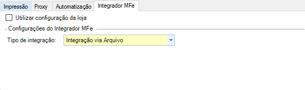 ✓ Utilizar configuração da loja: Ao marcar esta opção será considerado o tipo de integração configurada na aba integrador MFe da loja;