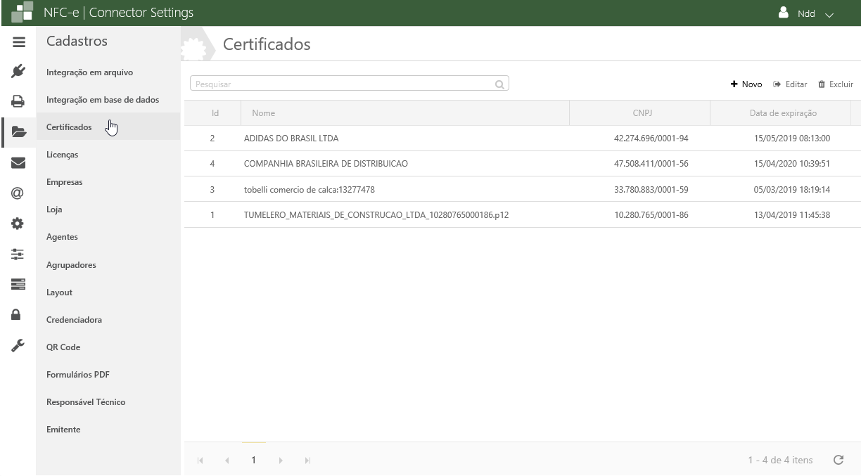 Acesse o e-Connector Settings e na área de cadastros, clique em Certificados. A seguinte tela é apresentada: