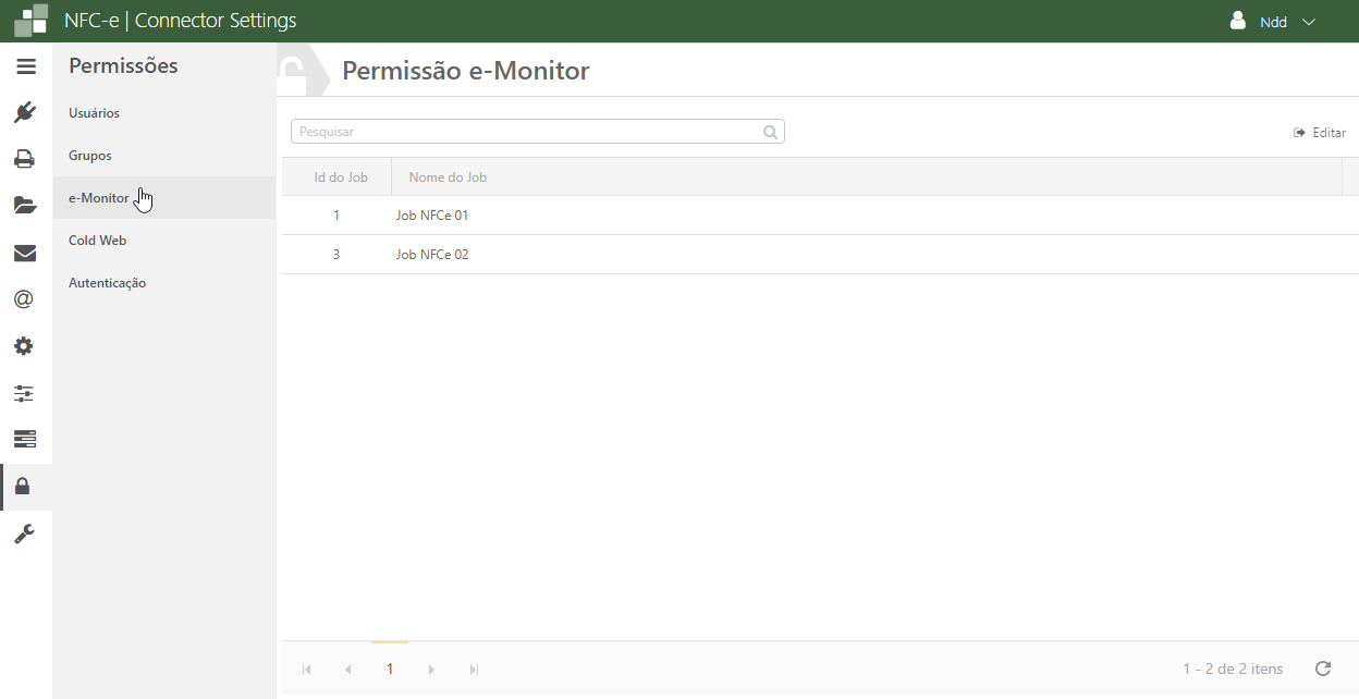 Acesse o e-Connector Settings e na área de Permissões, clique em e-Monitor. A seguinte tela é apresentada: