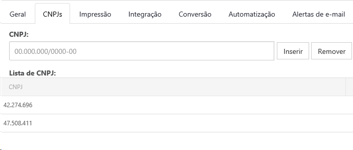 Informe o CNPJ da empresa, no campo CNPJ e clique em INSERIR para adicionar o mesmo, lembrando que pode ser informado o CNPJ completo (14 caracteres) ou apenas a raiz (8 caracteres).