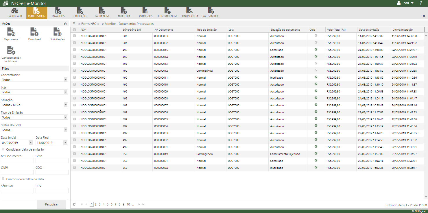 Nesta aba são exibidos todos os documentos processados, onde os dados informados na massa são apresentados de forma resumida através das colunas.