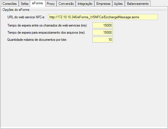 ✓ Tempo de espera para empacotamento dos arquivos (ms): Tempo para realizar os empacotamentos dos arquivos para envio para o e-Forms NFC-e;