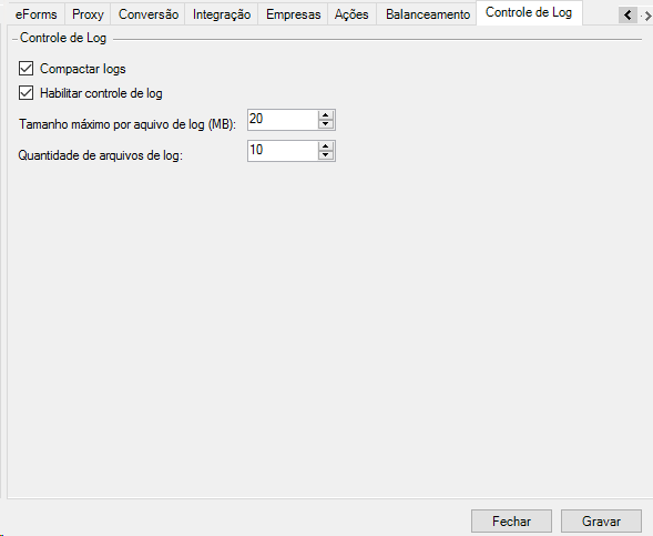 Através dessa aba é possível habilitar as configurações a respeito do controle de log, onde ao habilitar a opção 'Habilitar controle de log', os campos 'Tamanho máximo por arquivo de log (MB)' e 'Quantidade de arquivos de log' devem ser configurados de acordo com o desejado. Para compactar, deve ser habilitado a opção 'Compactar logs'.