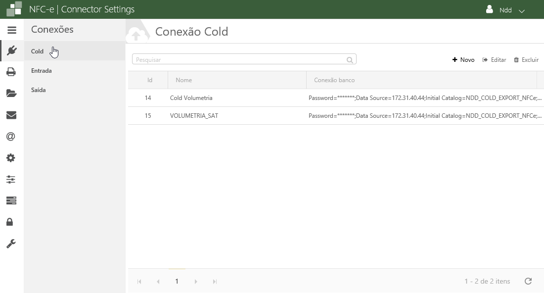 Acesse o e-Connector Settings e na área de conexões, clique em Cold. A seguinte tela é apresentada:
