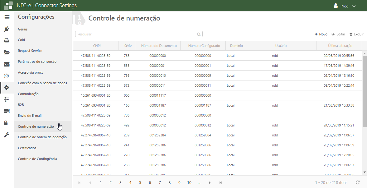 Acesse o e-Connector Settings e na área de configurações, clique em Controle de numeração. A seguinte tela é apresentada: