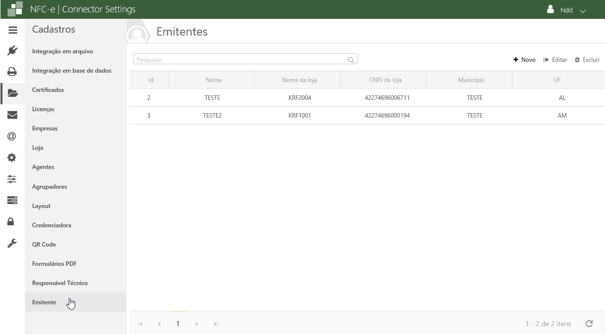 Acesse o e-Connector Settings e na área de cadastros, clique em Emitente. A seguinte tela é apresentada: