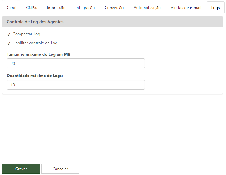 Através dessa aba é possível habilitar as configurações a respeito do controle de log, onde ao habilitar a opção 'Habilitar controle de log', os campos 'Tamanho máximo por arquivo de log (MB)' e 'Quantidade de arquivos de log' devem ser configurados de acordo com o desejado. Para compactar, deve ser habilitado a opção 'Compactar logs'.