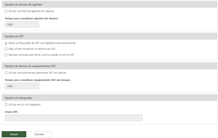 ✓ Gerar configuração de SAT (configdata) automaticamente: Habilitando este checkbox, será transportado automaticamente o configdata contendo as configurações do equipamento SAT para o agente. Os equipamentos SAT devem ser cadastrados na Loja;