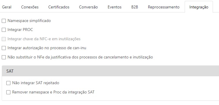 ✓ Remover namespace e proc da integração SAT: Ao marcar esta opção será removido o namespace e PROC da integração, quando a mesma for do tipo SAT.