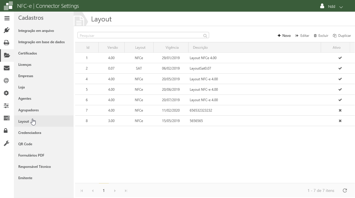 Acesse o e-Connector Settings e na área de cadastros, clique em Layout. A seguinte tela é apresentada: