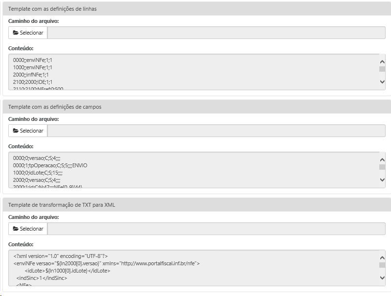 Para adicionar um template com as definições de linhas, campos e de transformação de TXT para XML, clique na opção de carregar o arquivo e informe o arquivo disponibilizado pela NDDigital, os quais encontram-se juntamente com os instaladores da solução.