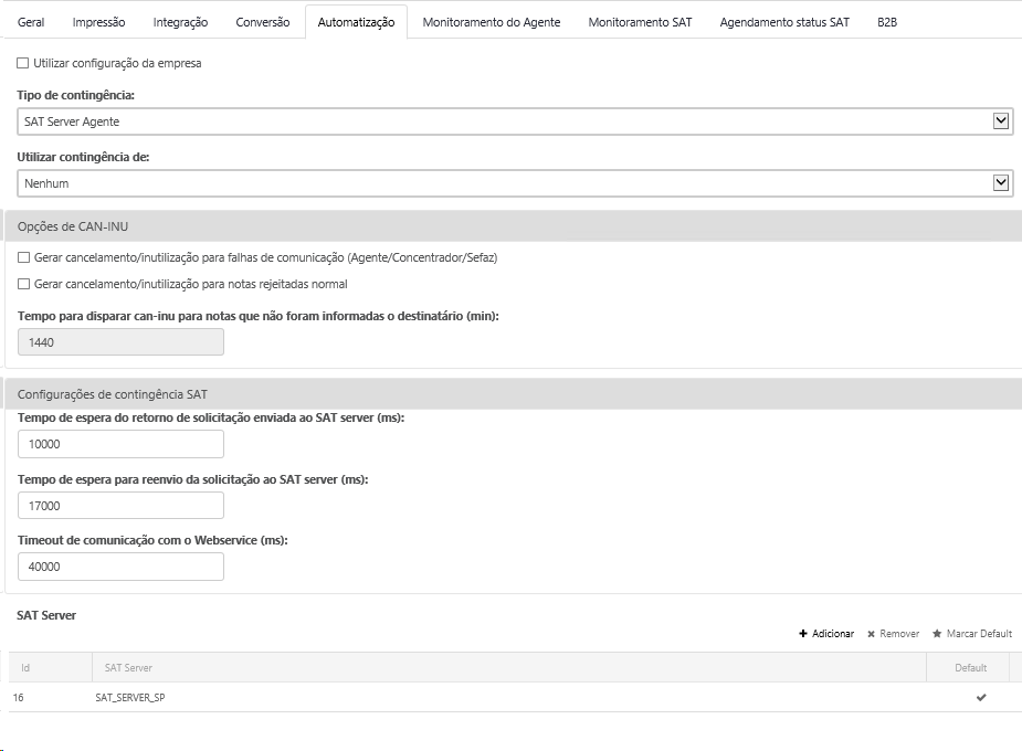 A área de Configurações de Contingência SAT somente é apresentada se o tipo de contingência selecionado for igual a SAT Server Agente, SAT Server Concentrador ou SAT Agente/Server Mista.
