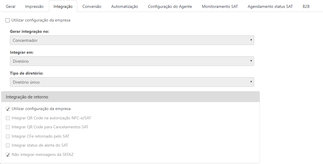 Ao marcar a opção Utilizar configuração da empresa, o restante das opções são desabilitadas pois será herdado as configurações da empresa.
