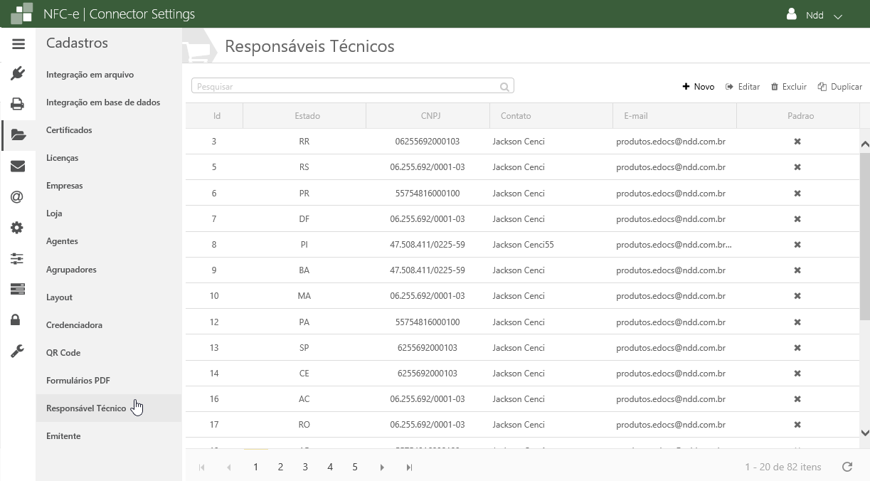 ✓ Não terá responsável técnico os documentos sem o cadastro no Settings para a UF de onde os mesmos serão emitidos e não ser informado os campos na massa; ✓ Será apresentado a tela de cadastro, onde os botões de adicionar, duplicar e excluir estão disponibilizados apenas para usuário com perfil master.