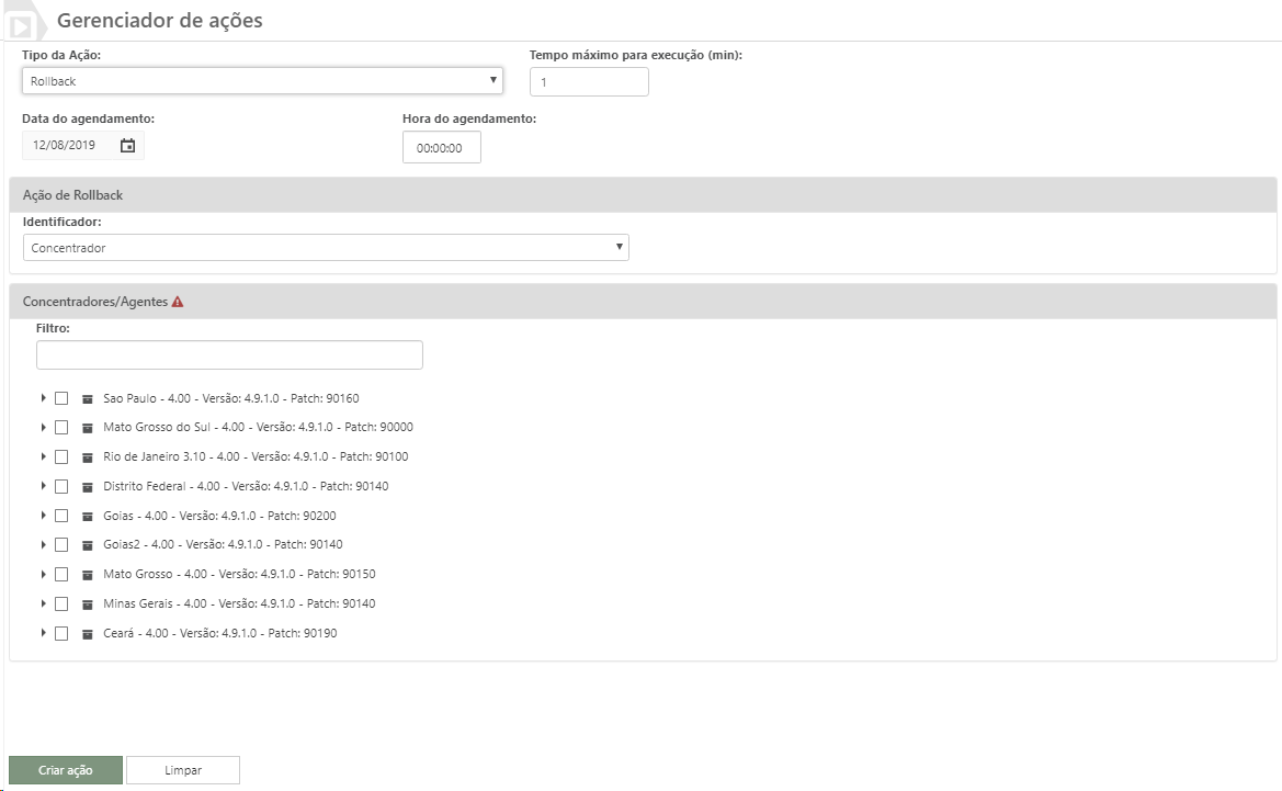 - Após ser criado uma ação, a mesma pode ser pesquisada na aba pesquisar ações; - O processo de rollback deverá ser realizado com a certeza de que o Concentrador e o Agente estão em uma versão posterior a 4.7.2.0.