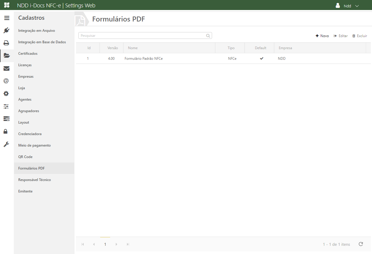 Acesse o e-Connector Settings e na área de cadastros, clique em Formulários PDF. A seguinte tela é apresentada: