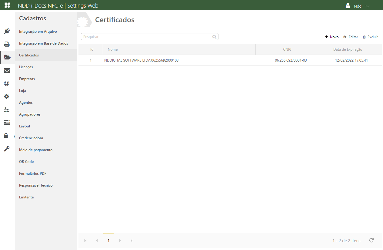 Acesse o e-Connector Settings e na área de cadastros, clique em Certificados. A seguinte tela é apresentada: