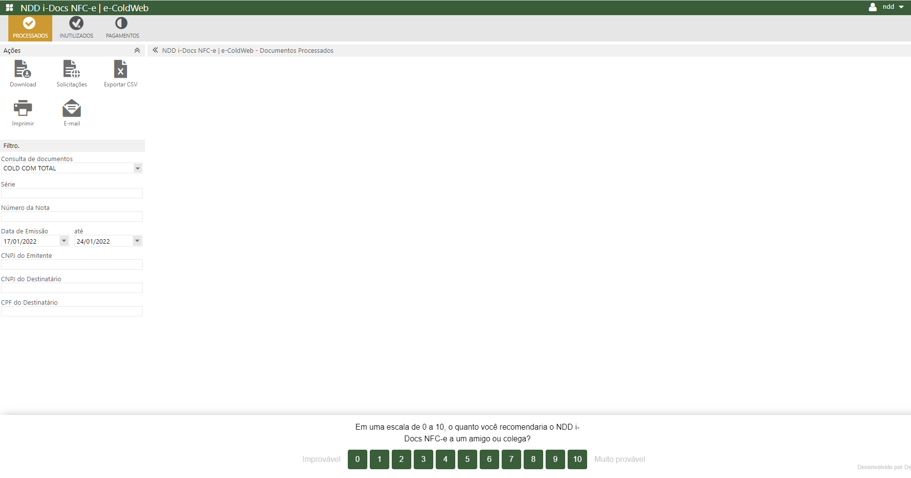 ✓ Consulta de documentos: Selecione a conexão cold cadastrada, ao selecionar será apresentado os documentos processados nesta saída selecionada;